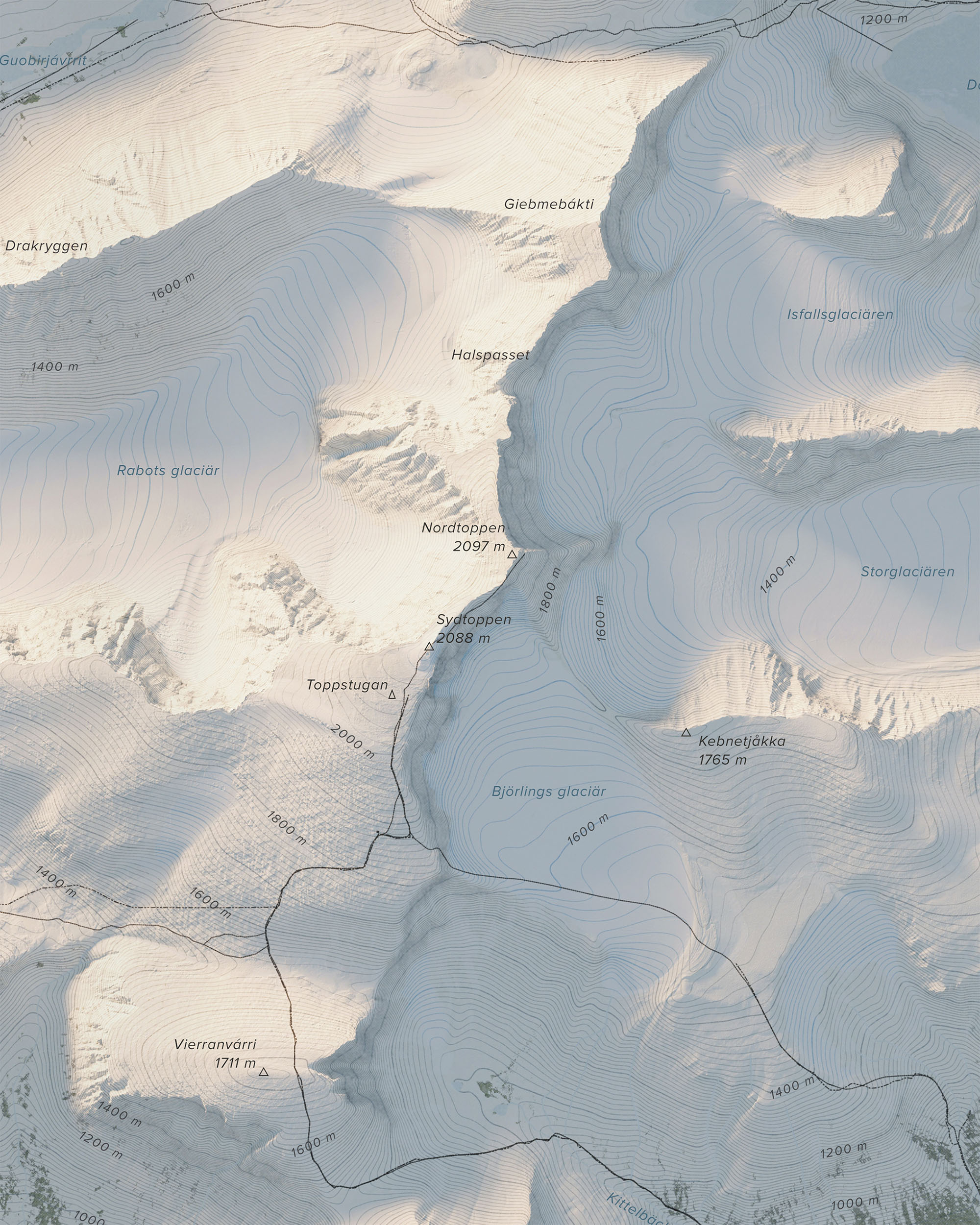 Landskapet präglas av dramatiska kontraster – smala bergsryggar som Drakryggen, vidsträckta glaciärer och klarblå glaciärsjöar som blänker mellan topparna. Här möts snöklädda höjder, karga stenfält och vida dalgångar i ett av landets mest storslagna och ikoniska fjällandskap.