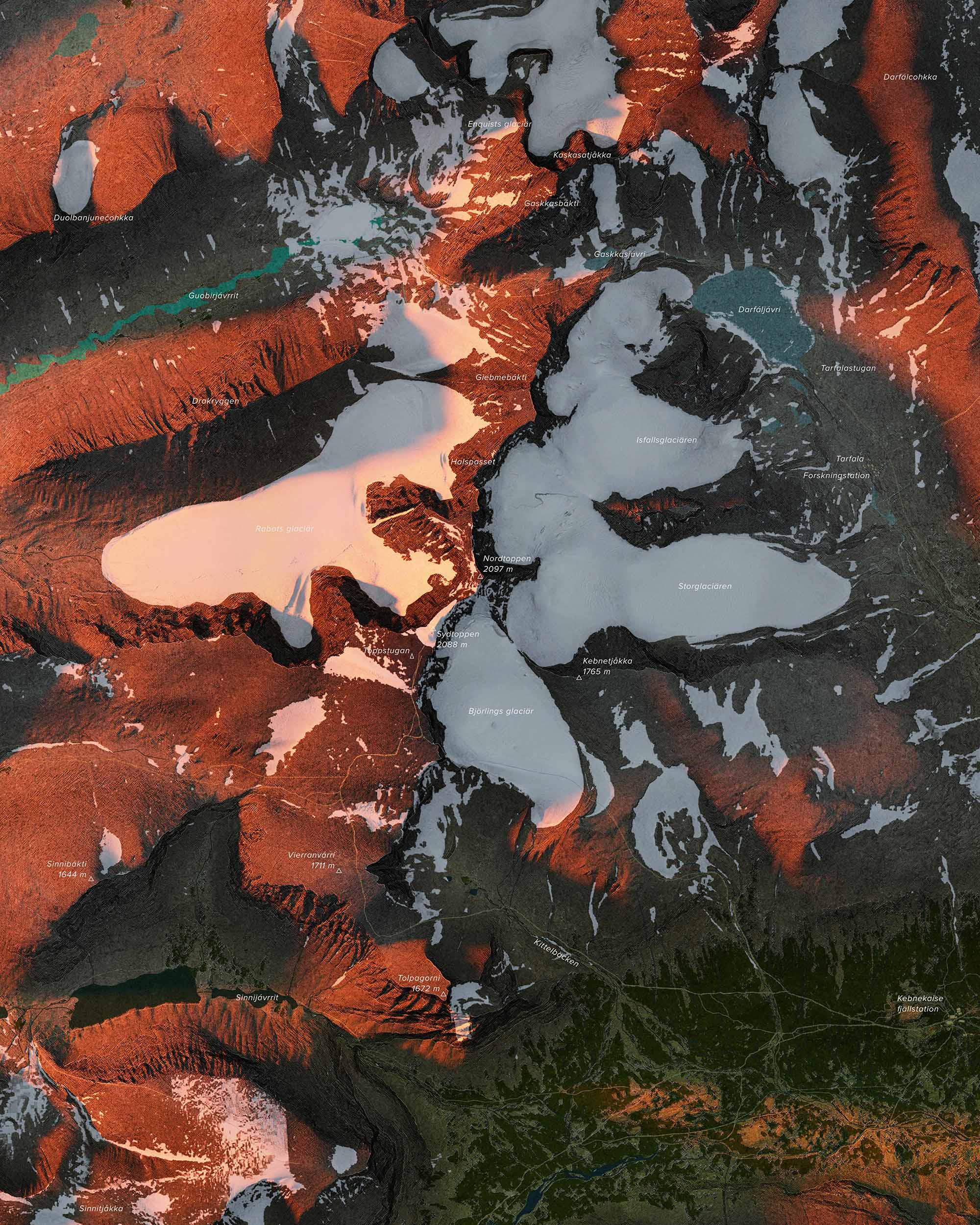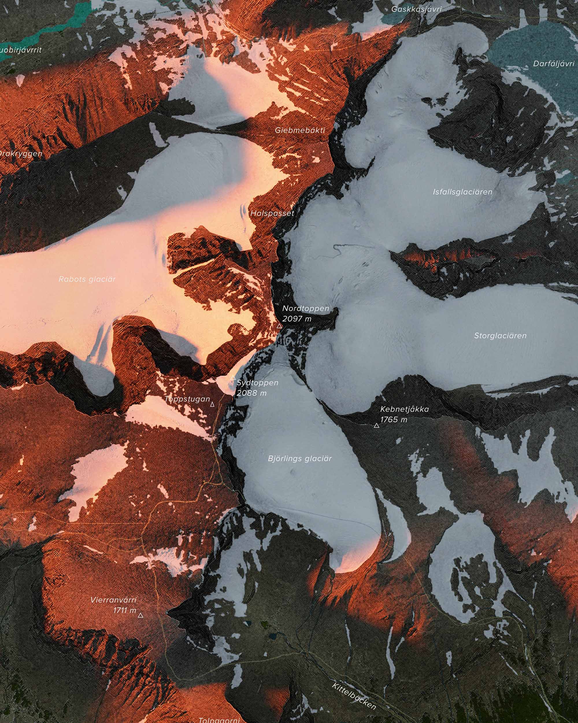 En detaljrik och naturtrogen illustration i skala 1:26 000 av Kebnekaise med dess terräng och omgivande miljö. Format 40×50 cm.