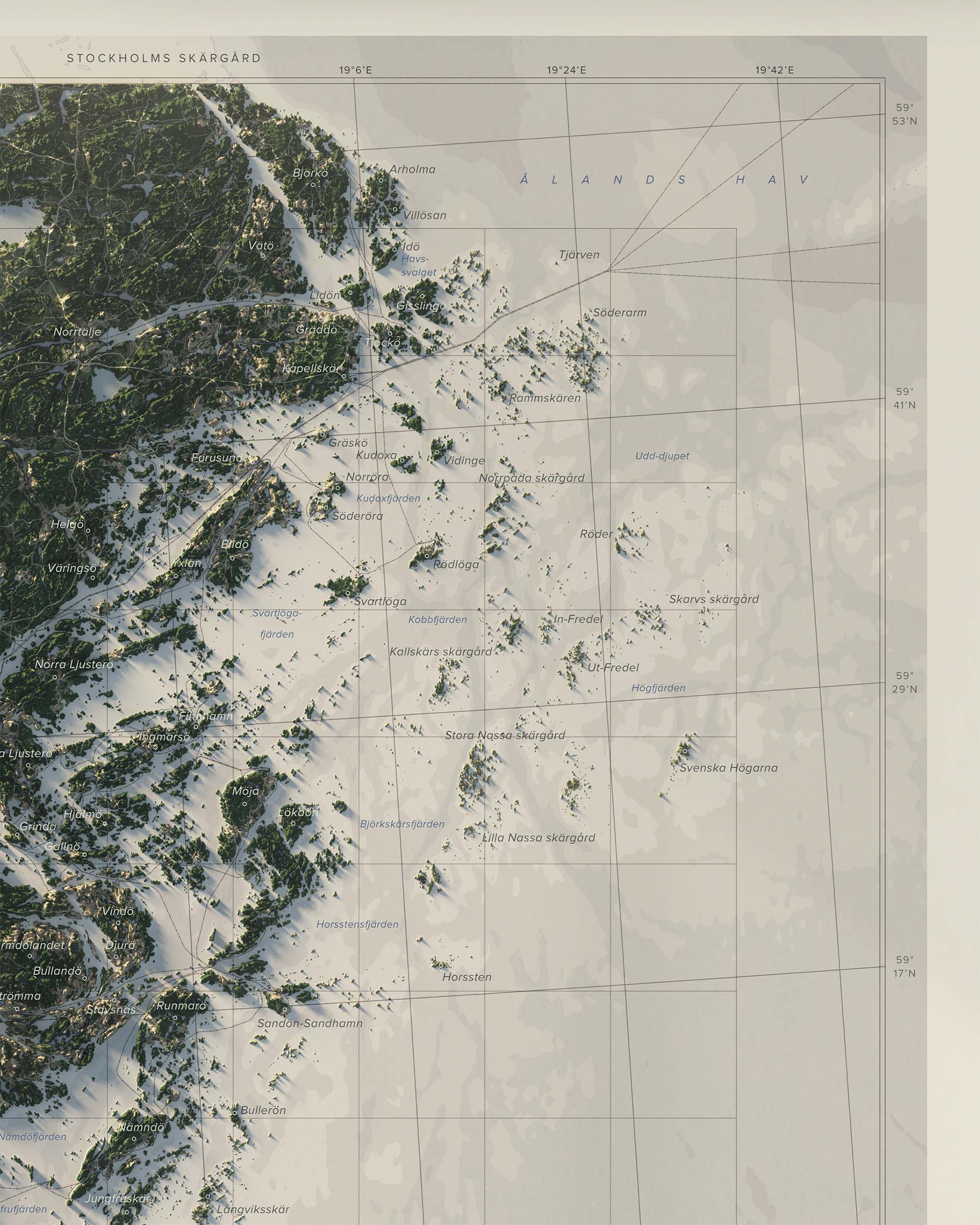 Detaljerad översiktskarta över Stockholms skärgård. Kartan sträcker sig från Väddö/ Björkö och Arholma i norr till Öja-Landsort i söder.