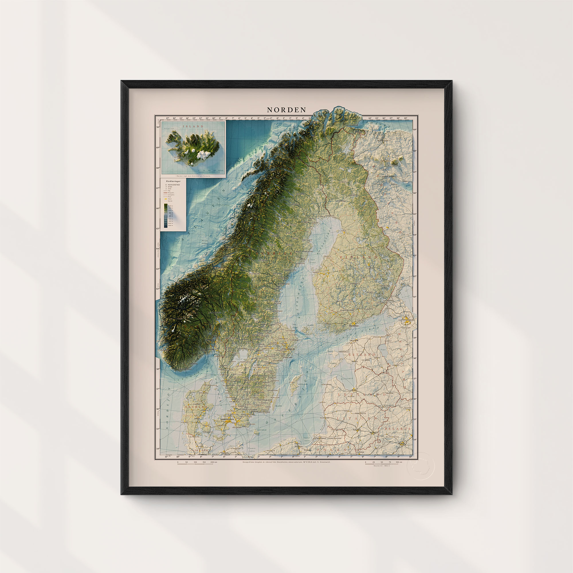 Väggkarta över Sverige med omgivande länder i Norden. Motivet är skapad med hjälp av verkliga höjddata och djupdata (terrängen under havsytan).