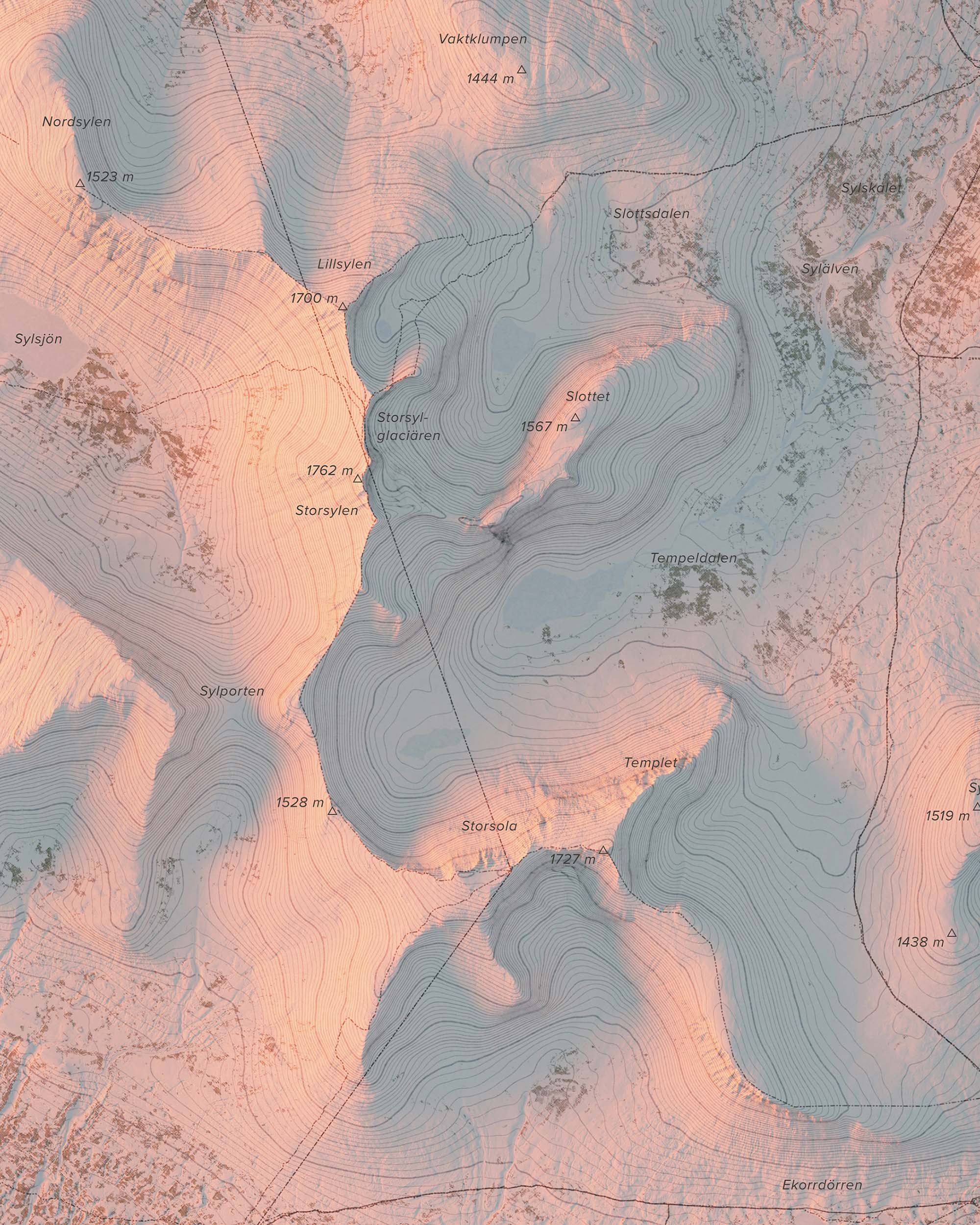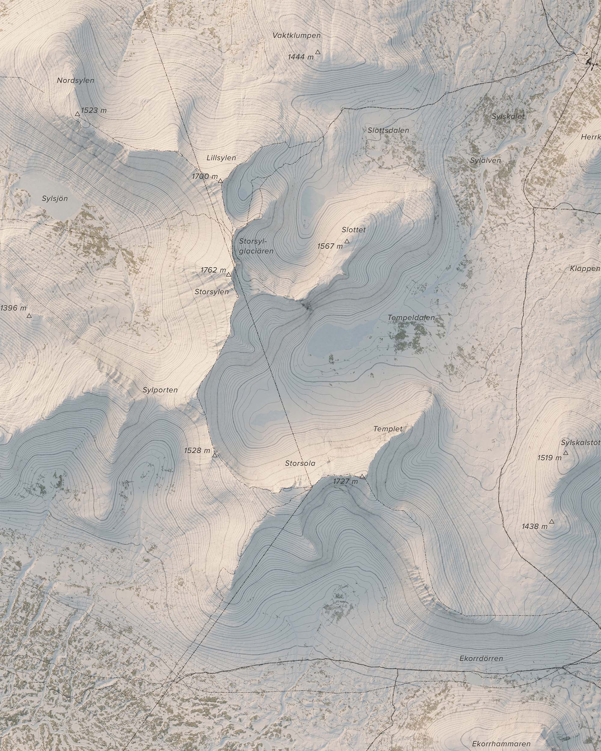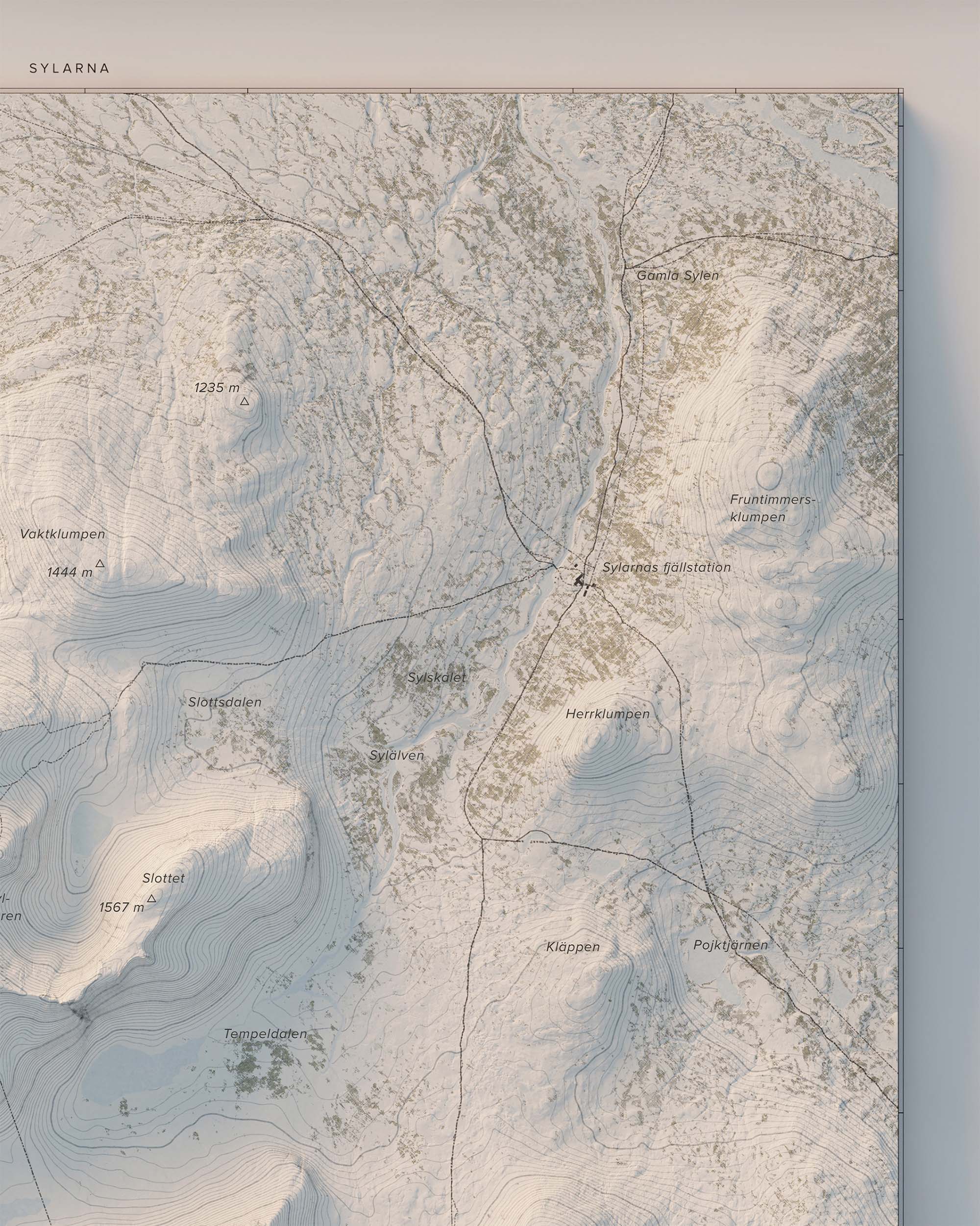 En detaljrik fjällkarta i skala 1:30 000 över Sylmassivet med dess omgivande natur. Väggkarta i format 40×50 cm.
