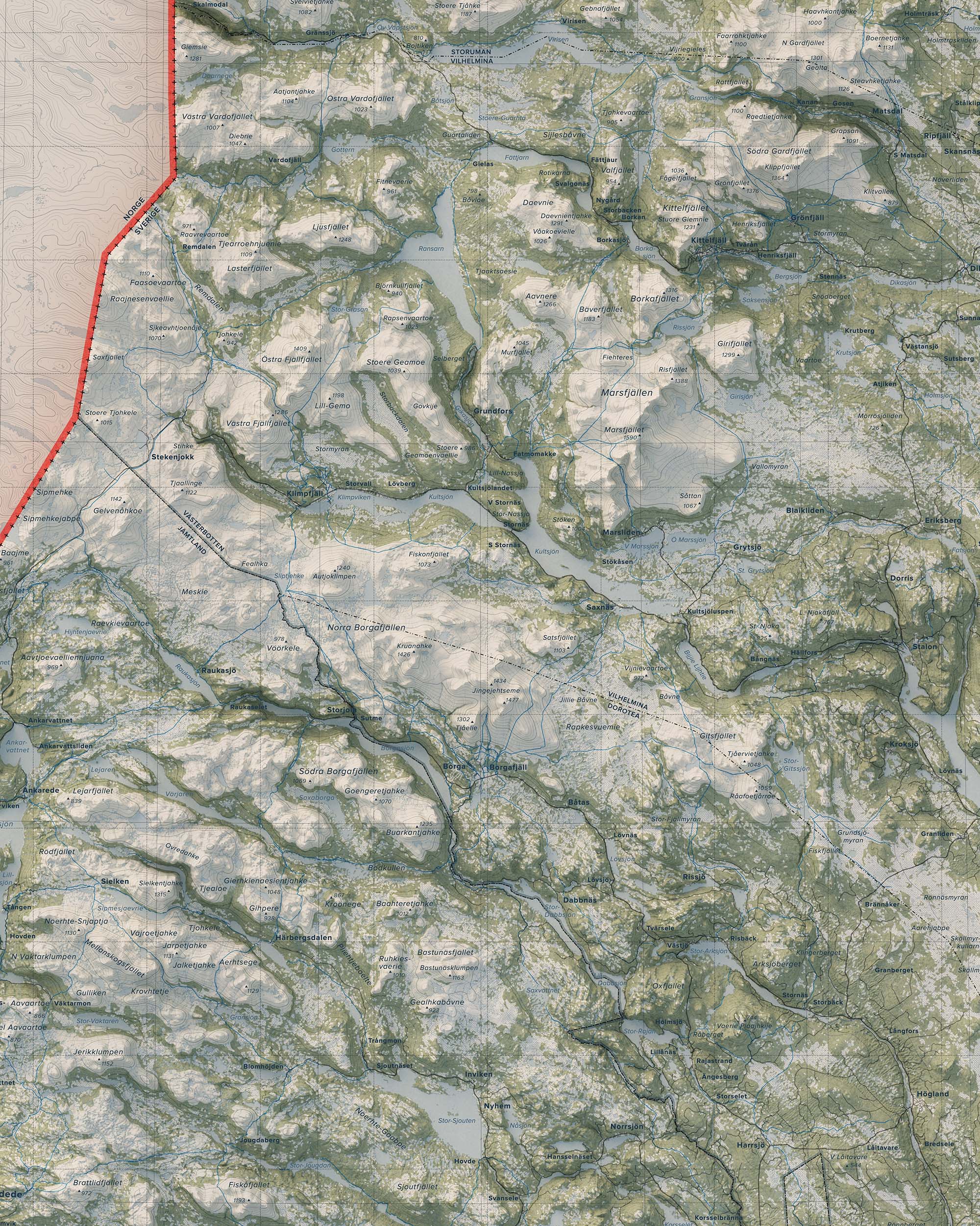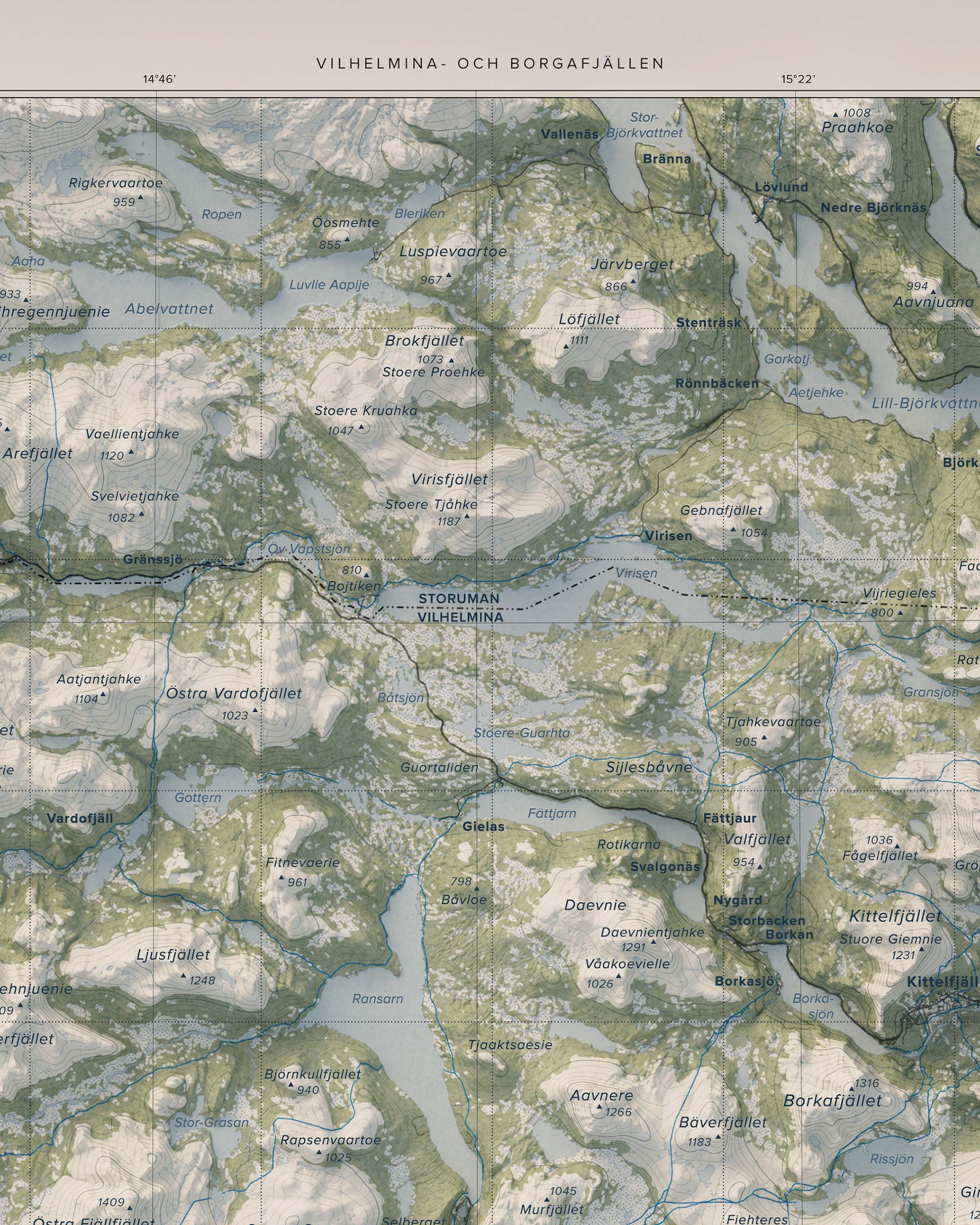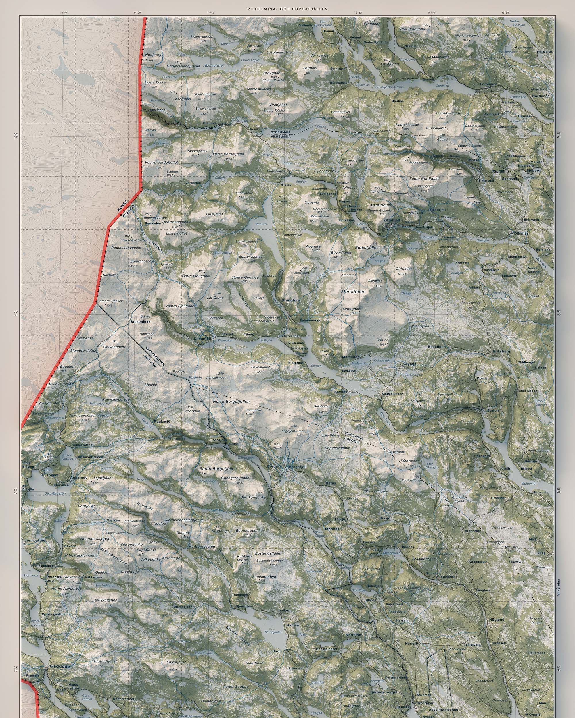 Vilhelmina- och Borgafjällen präglas av en variationsrik fjällmiljö – från karga högfjäll och blockrika sluttningar till mjukare dalgångar och sjösystem. Här finns leder och områden för vandring, toppturer, skidåkning och skoter, liksom stillsamma stråk för fiske och naturupplevelser. Den större överblicken lyfter fram sambanden mellan fjällmassiv, dalgångar och vattensystem och ger en tydlig bild av landskapets helhet.