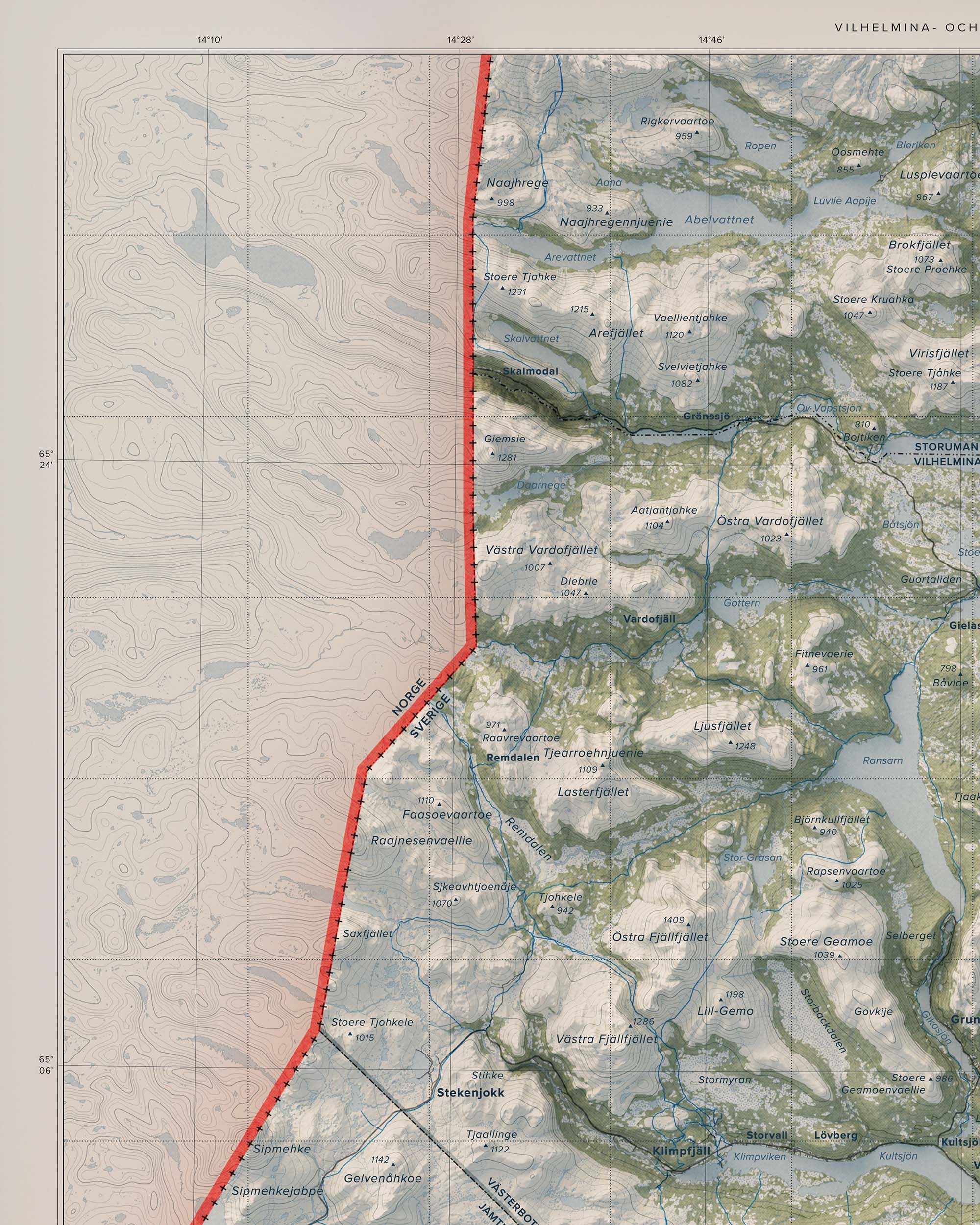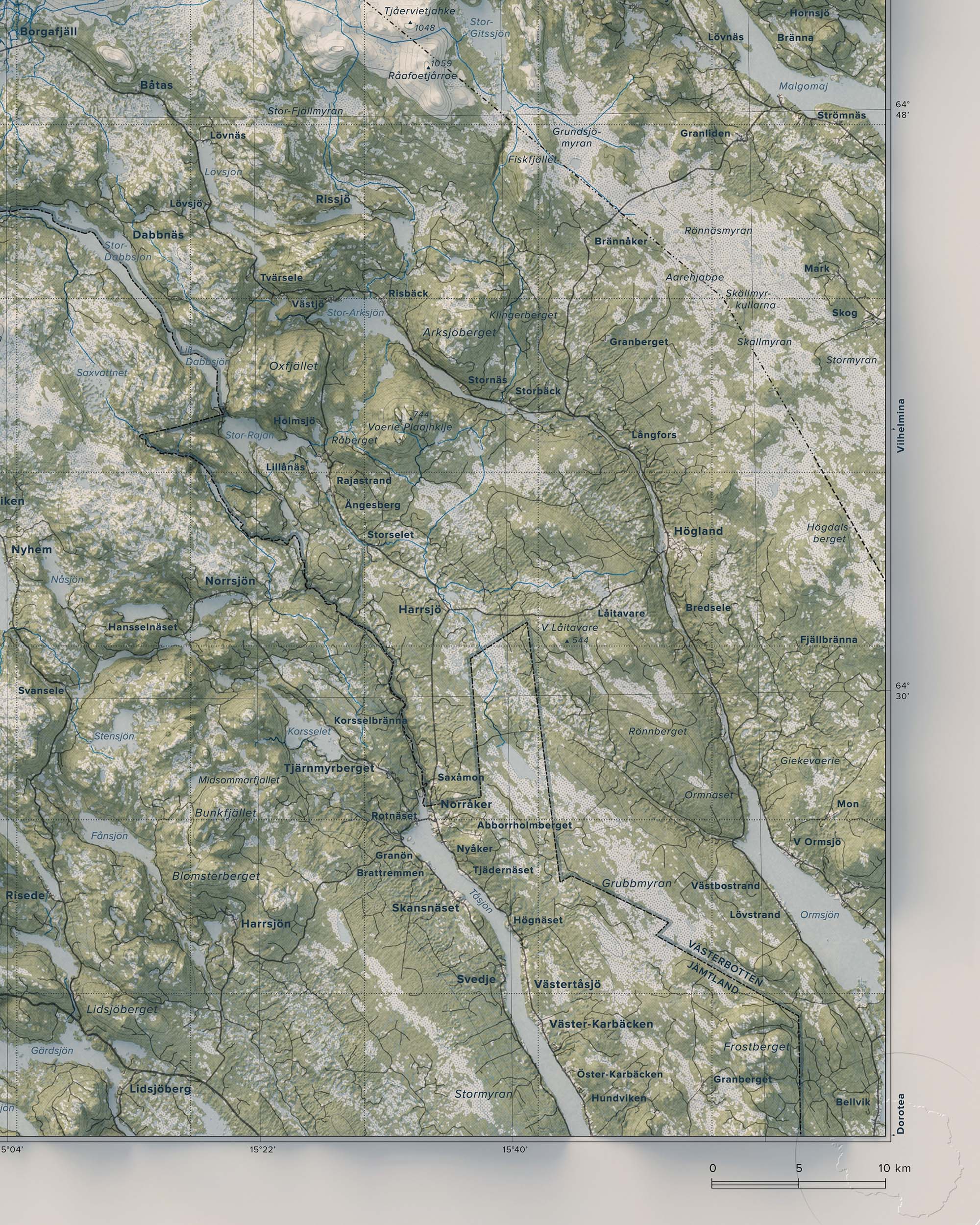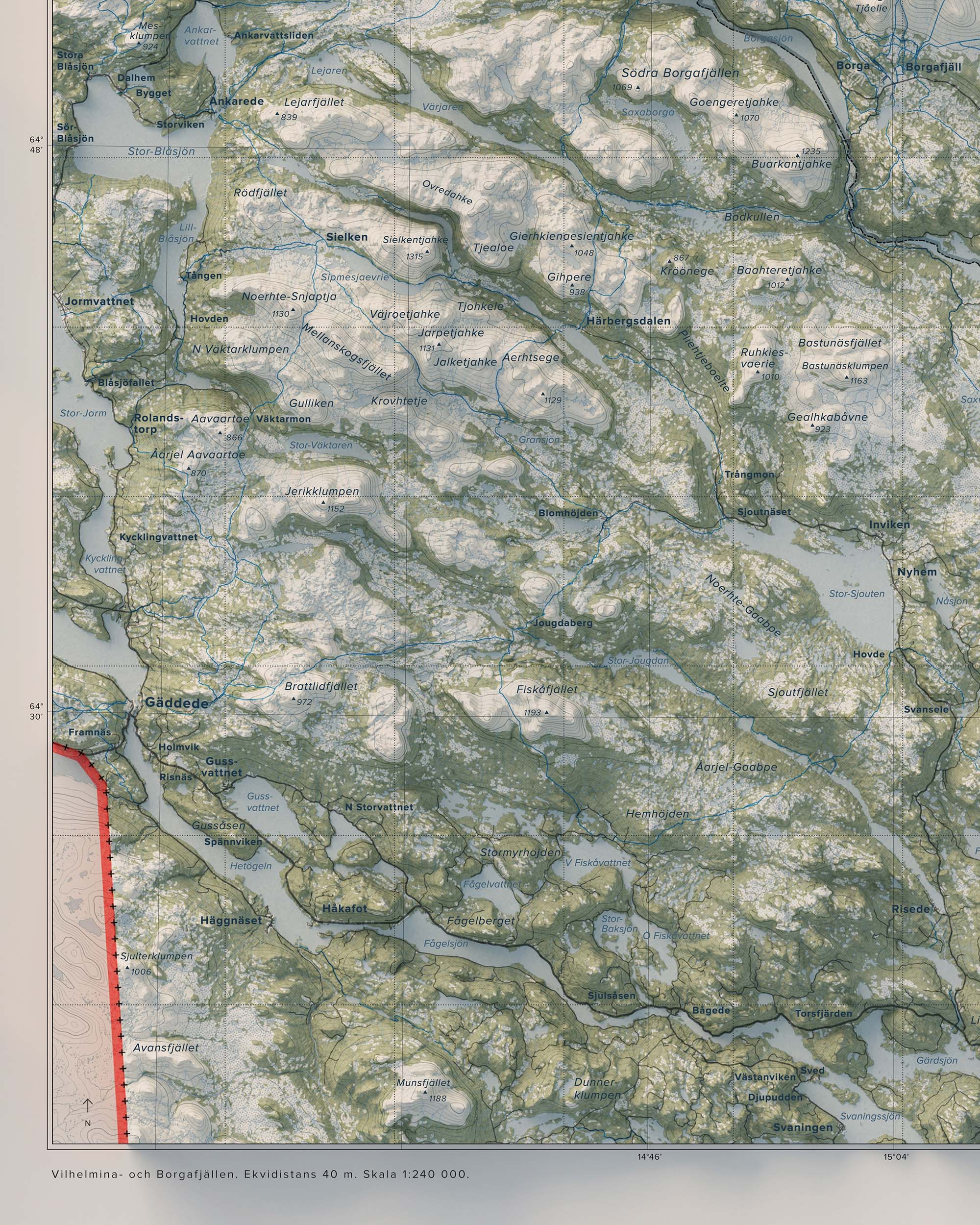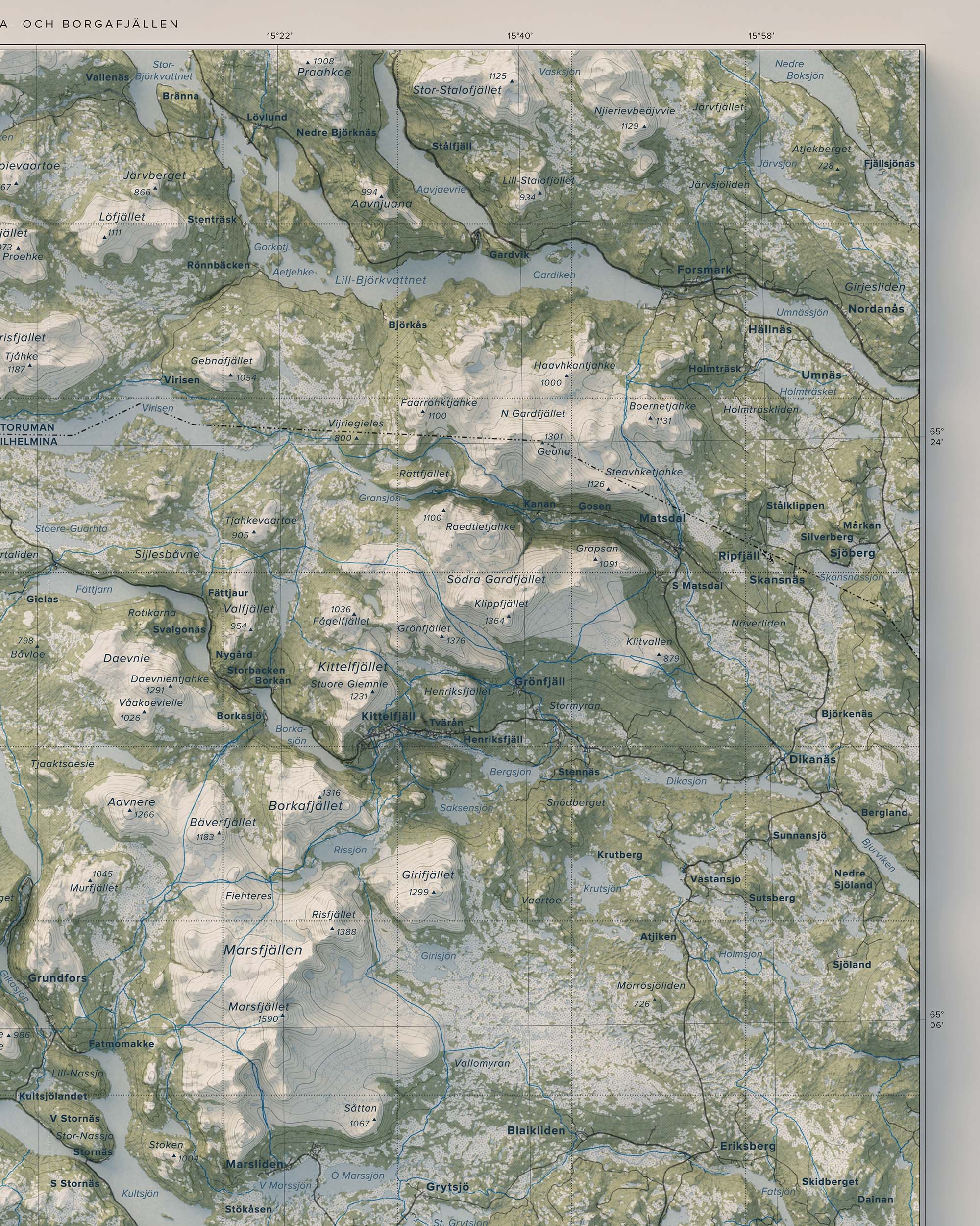 Vilhelmina- och Borgafjällen präglas av en variationsrik fjällmiljö – från karga högfjäll och blockrika sluttningar till mjukare dalgångar och sjösystem. Här finns leder och områden för vandring, toppturer, skidåkning och skoter, liksom stillsamma stråk för fiske och naturupplevelser. Den större överblicken lyfter fram sambanden mellan fjällmassiv, dalgångar och vattensystem och ger en tydlig bild av landskapets helhet.