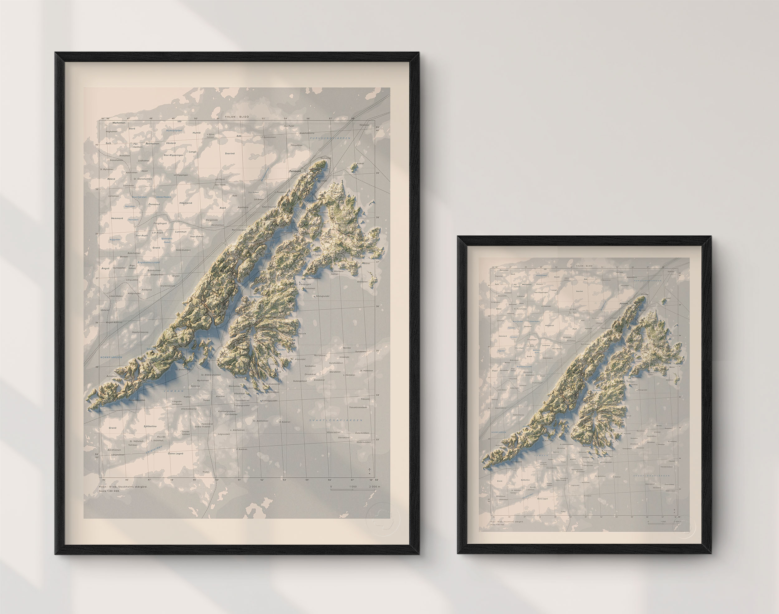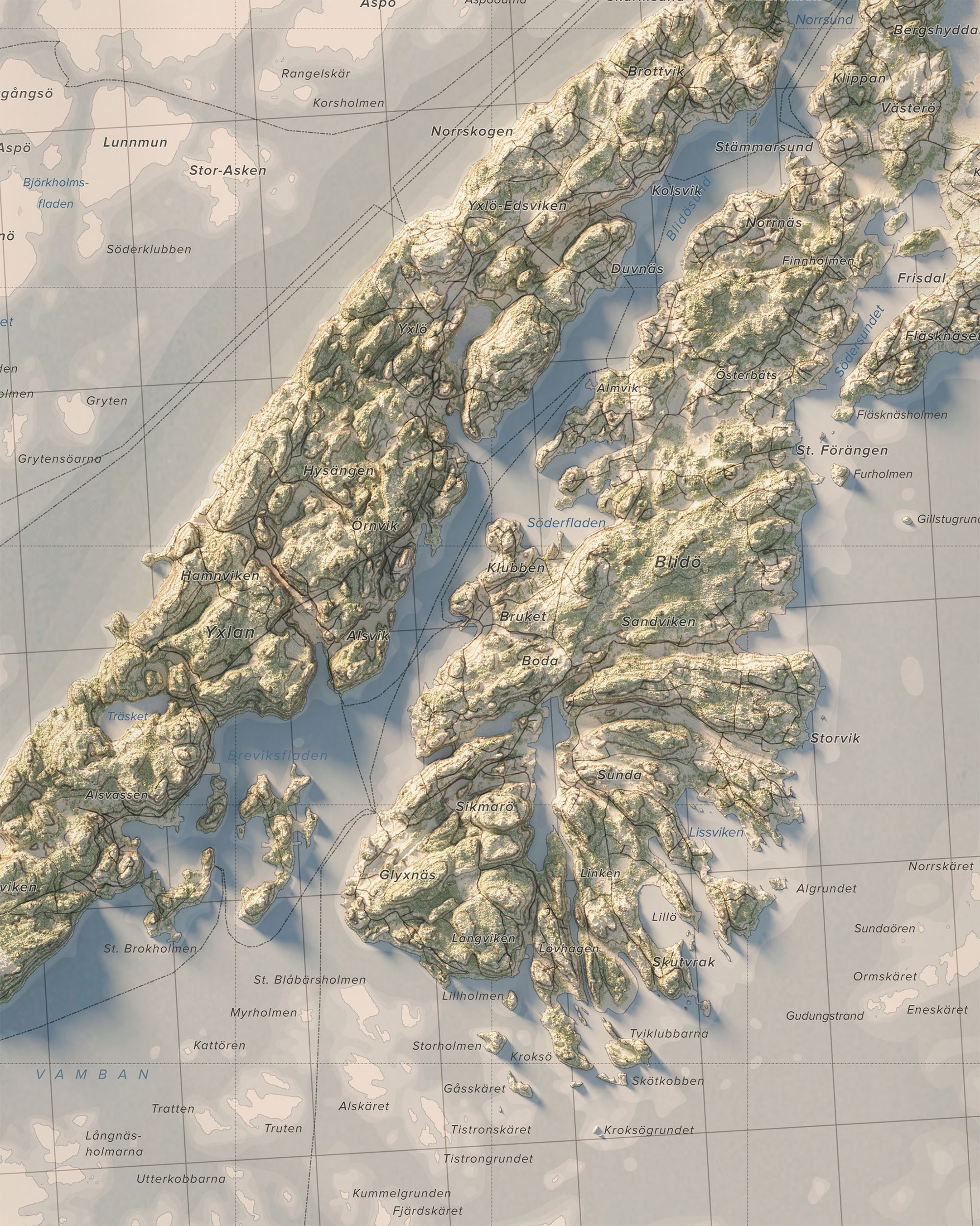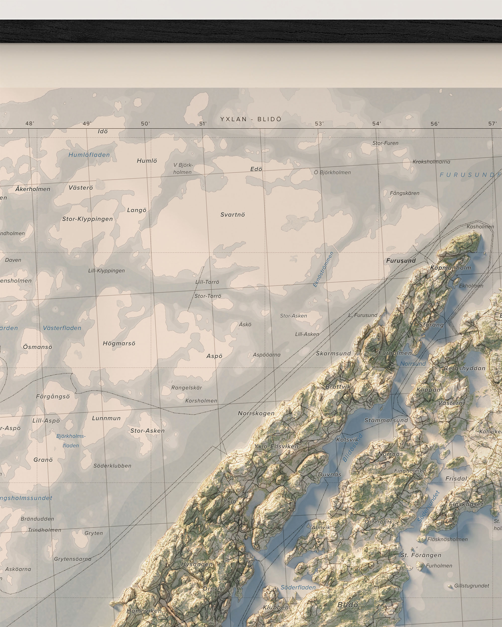 Upplev Yxlan och Blidö och de omkringliggande öarna i Stockholms skärgård med denna stilrena och detaljrika väggkarta.