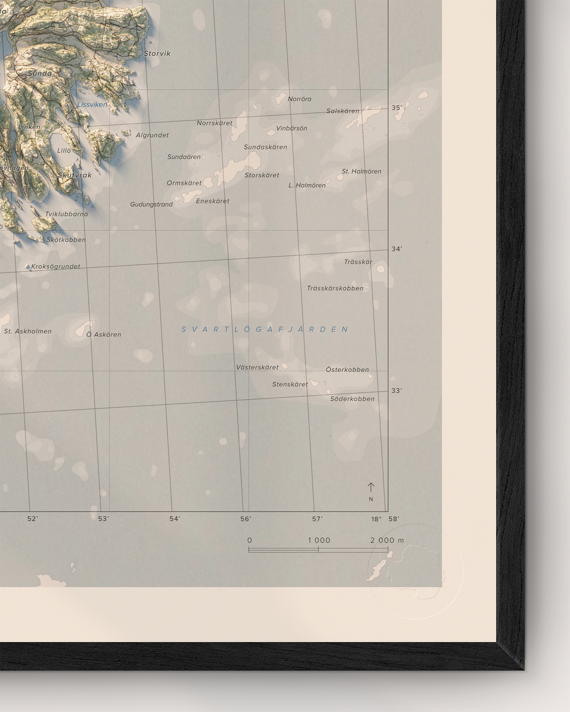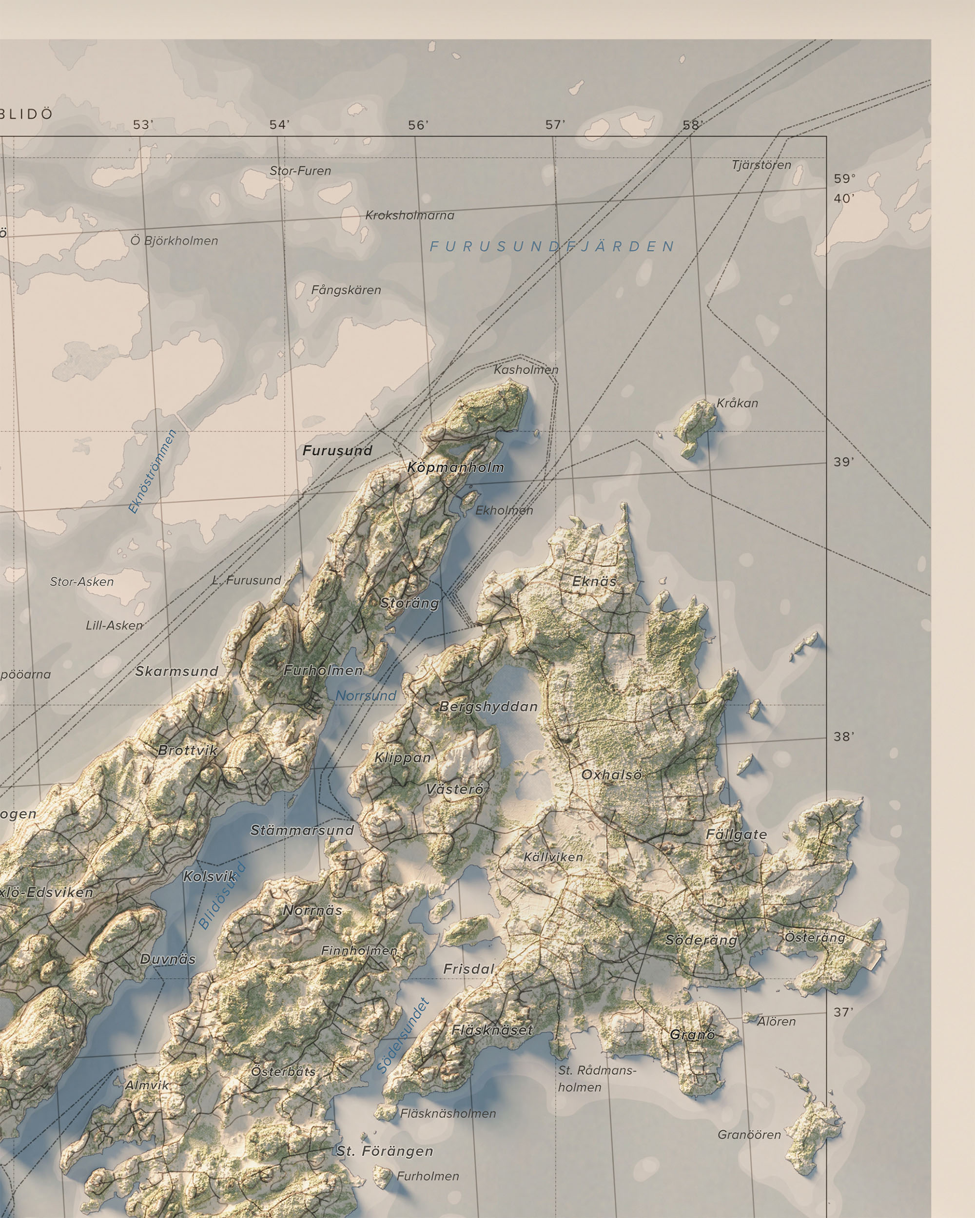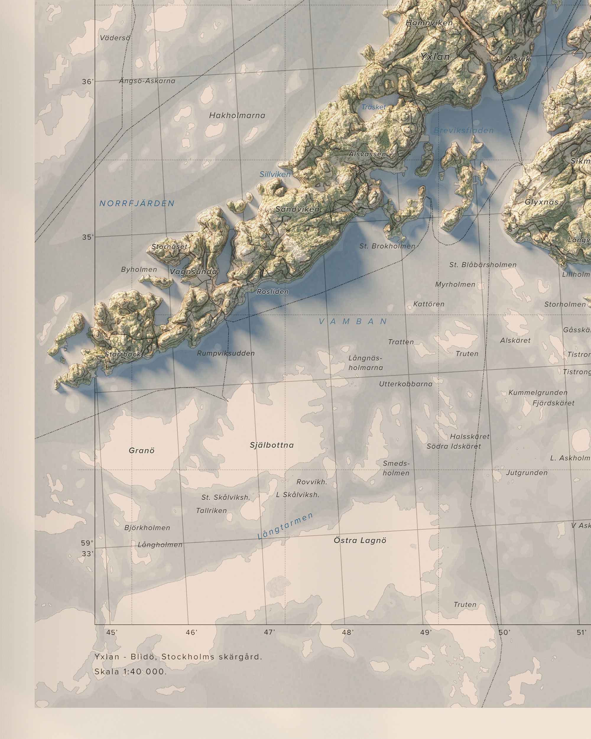 Upplev Yxlan och Blidö och de omkringliggande öarna i Stockholms skärgård med denna stilrena och detaljrika väggkarta.